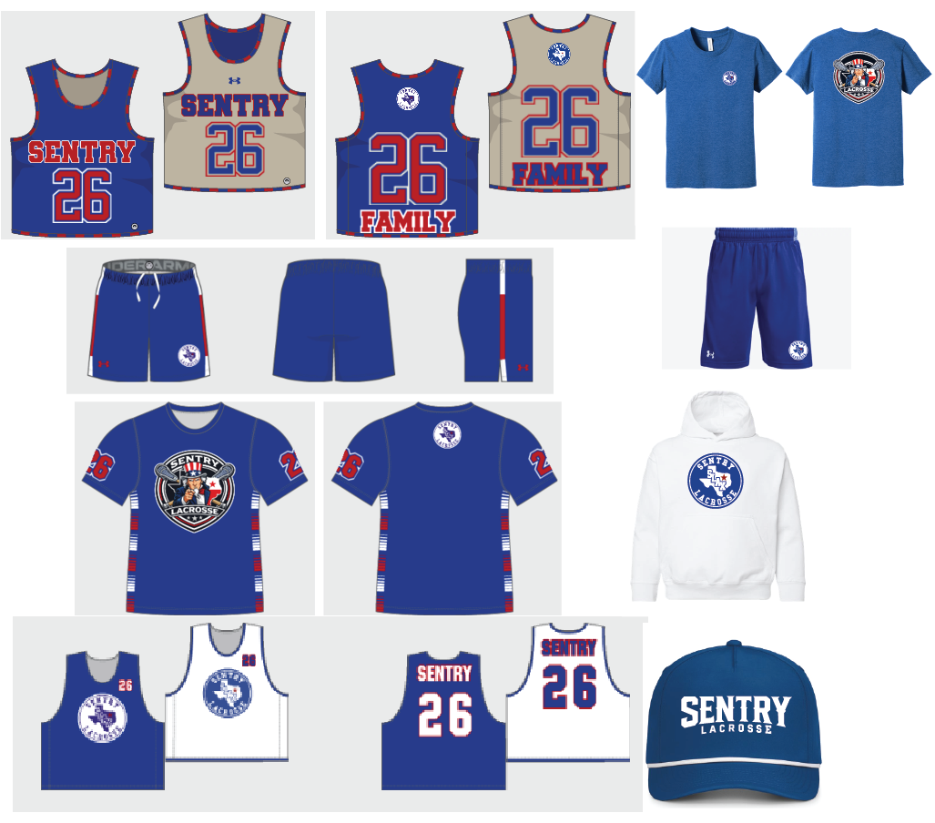 Includes sentry game reversible, game short, shooting shirt, practice reversible, practice short, cotton tee, fleece hoodie, and Sentry rope hat.